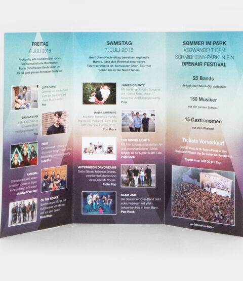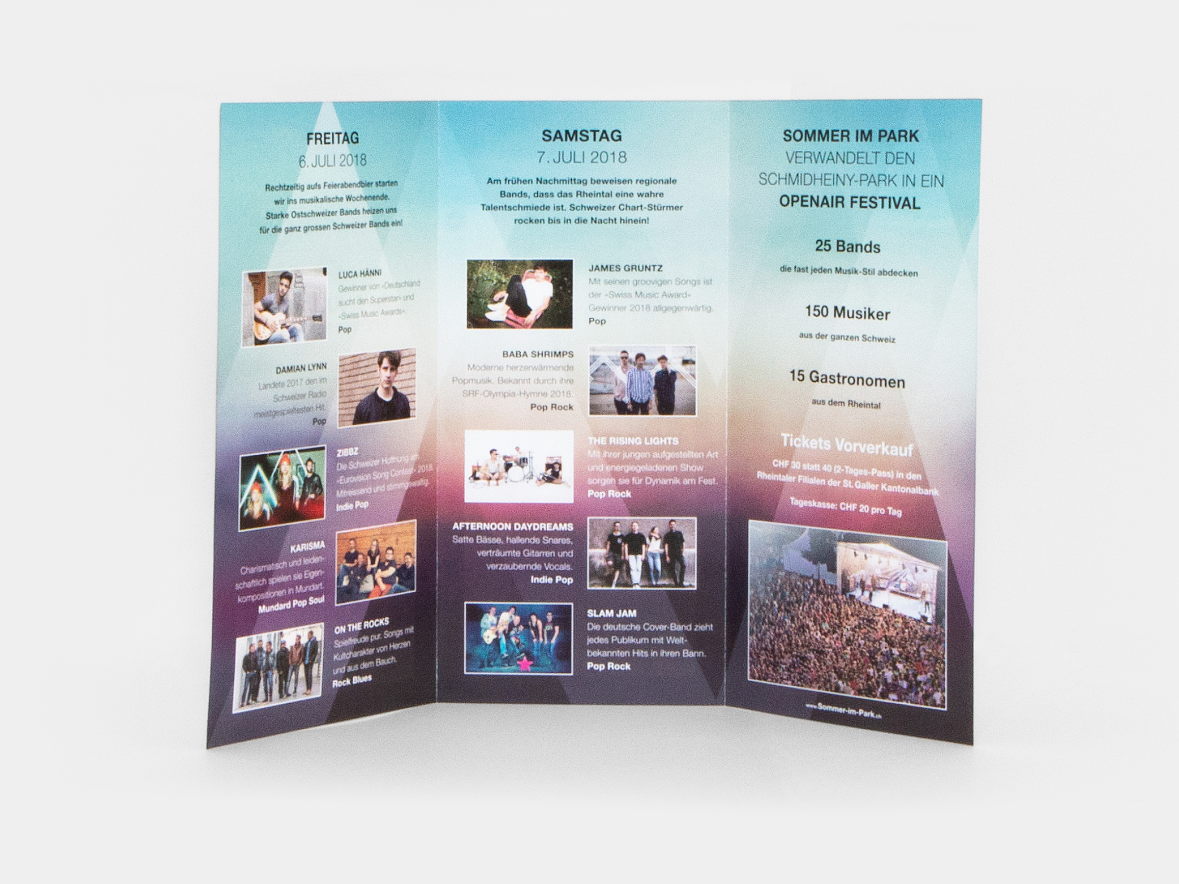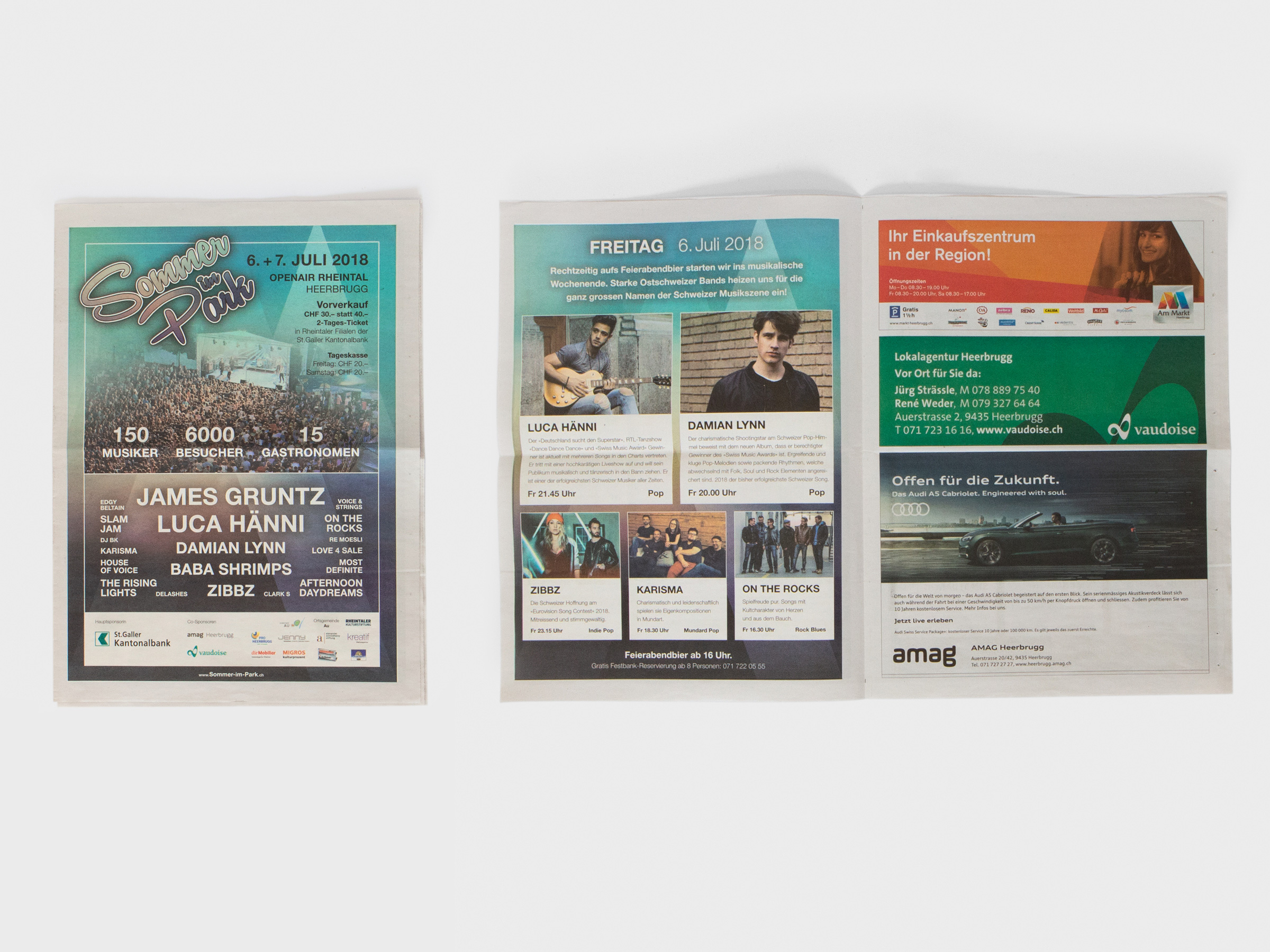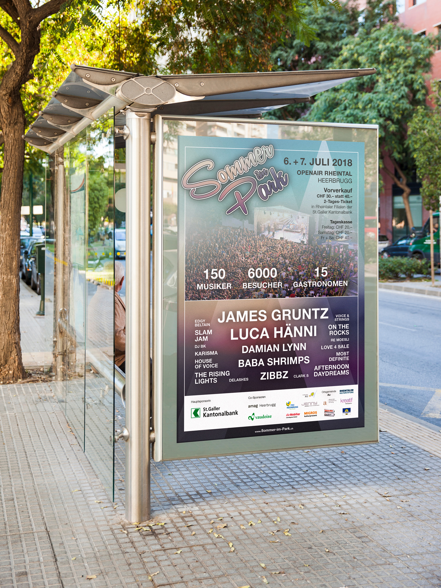 Openair Sommer im Park Eventorganisation, Werbeauftritt, Logo, Video, Fotografie, Webseite, Werbemittel, Inserat-, Plakat- sowie Social-Media-Kampagne und Programmzeitung. KundeOpenair Sommer im ParkJahr2019ArbeitenDesign, Veranstaltungen, Werbung/Marketing