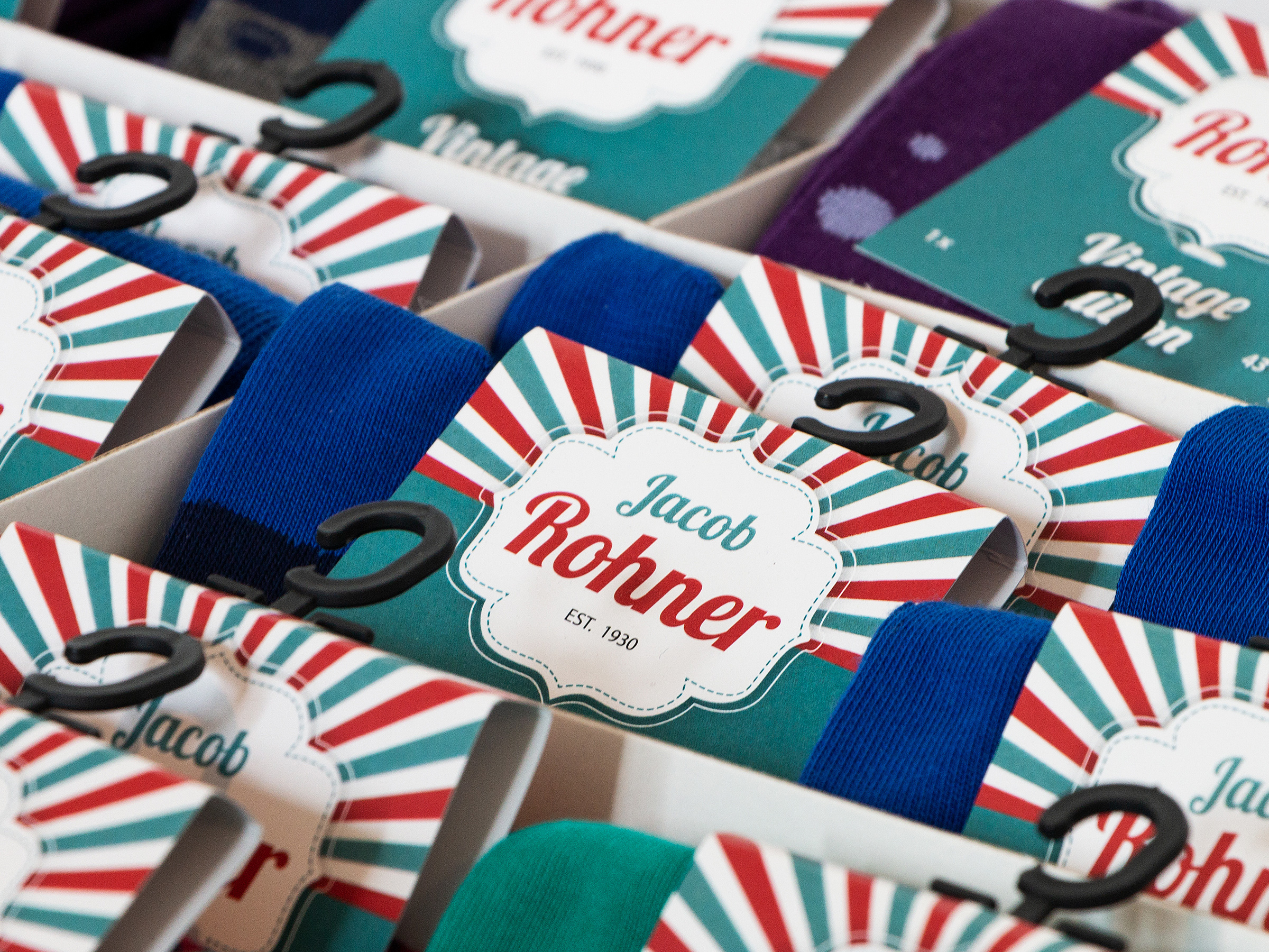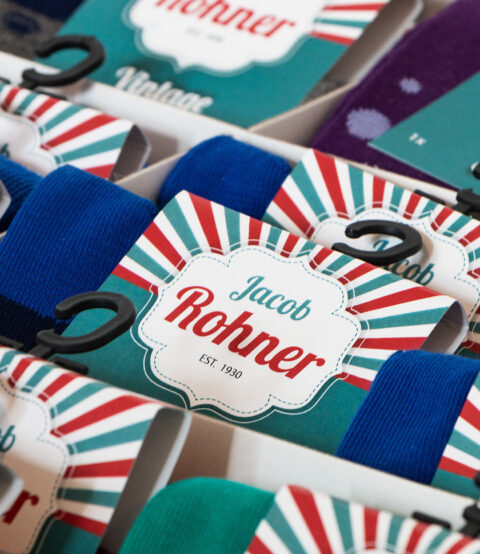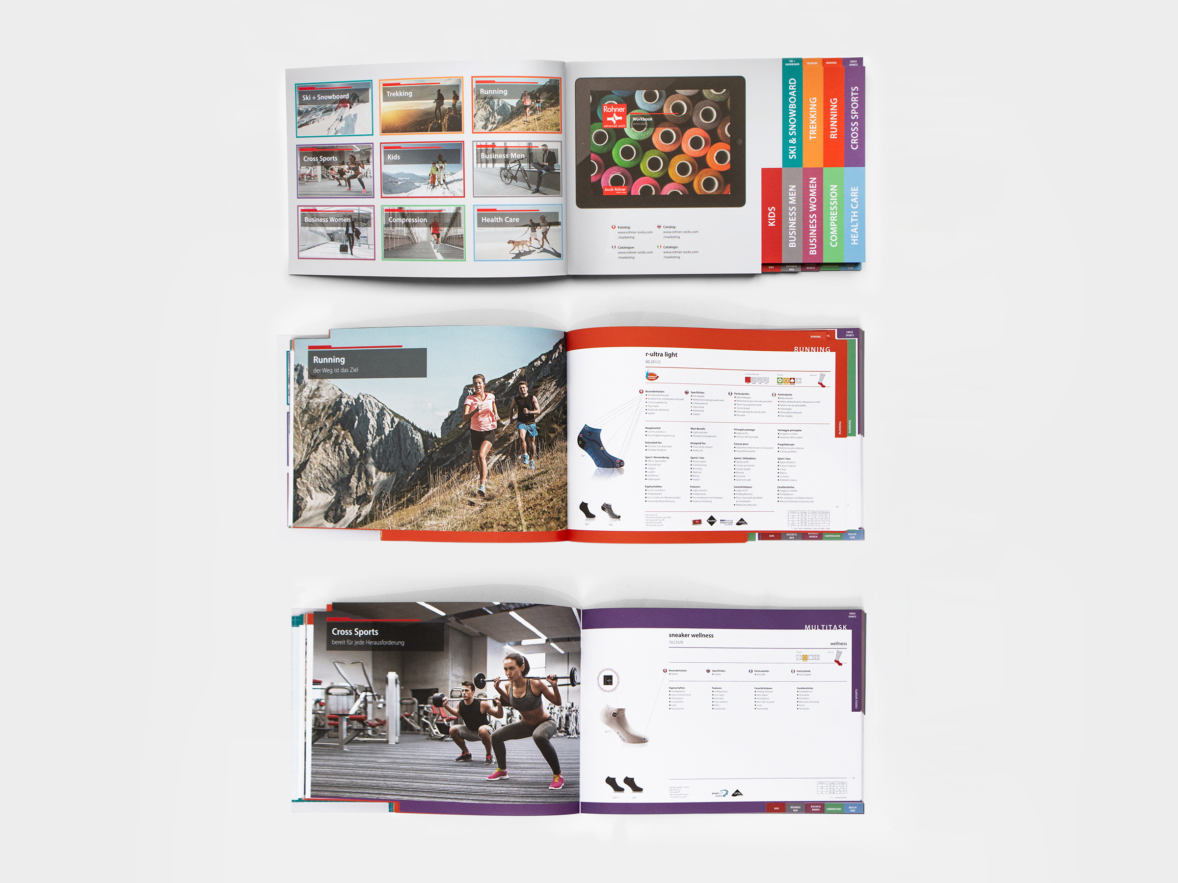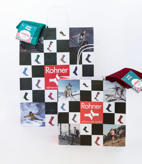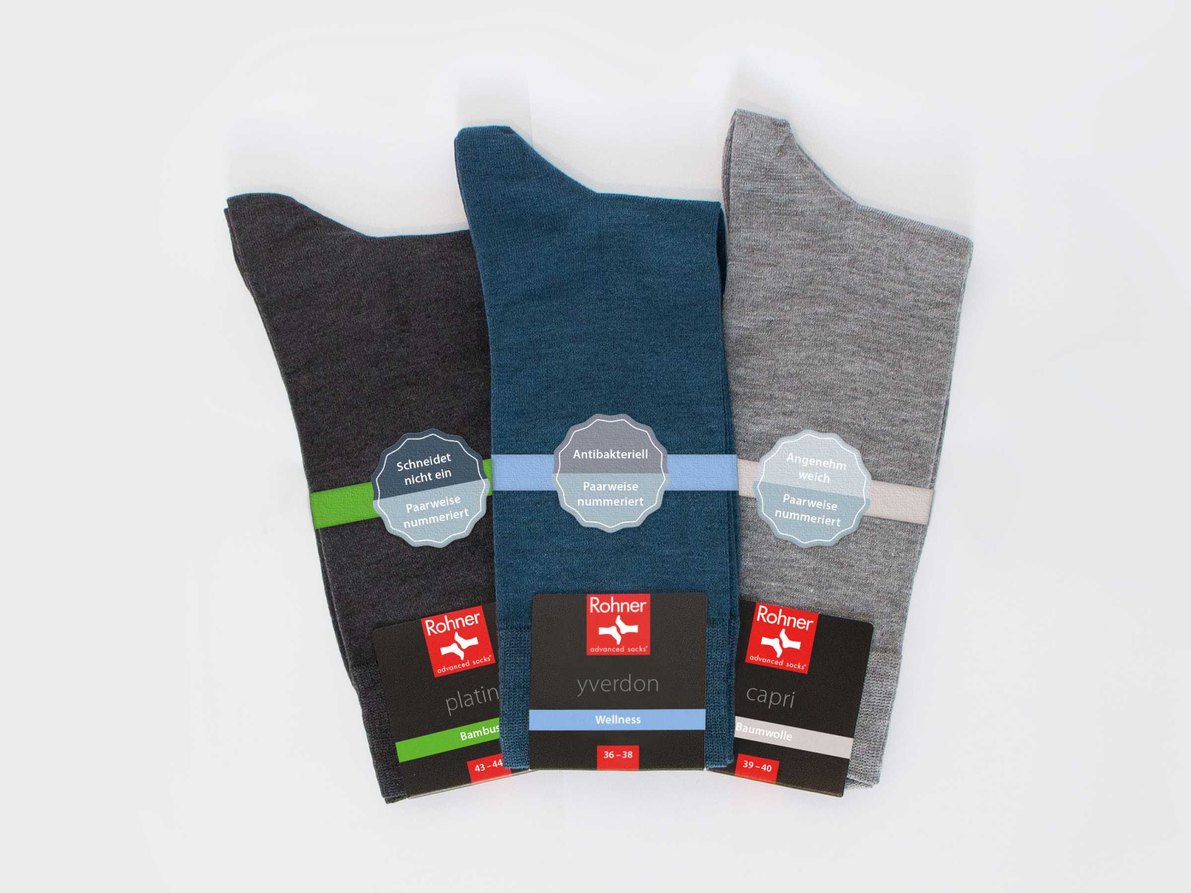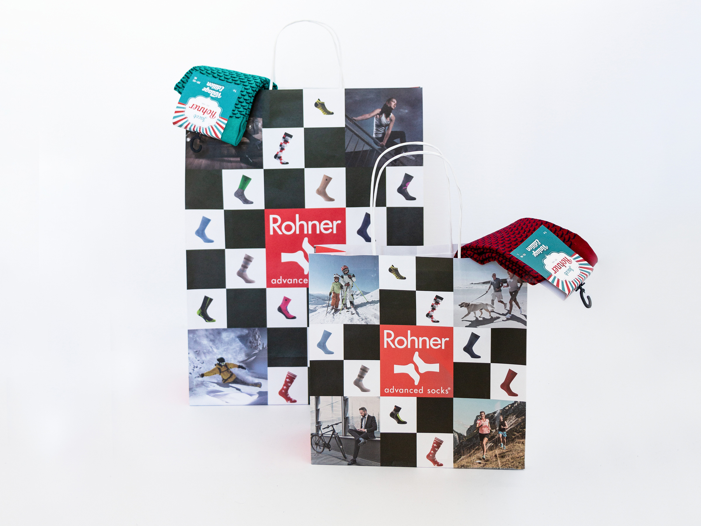 Rohner Socken Werbeauftritt, Messestand und Produktkatalog mit Register. Werbeauftritt diverser Marken, Produktverpackungen und Tragtaschen. KundeRohner SockenJahr2019ArbeitenDesign, Foto, Video und 3D-Animation
