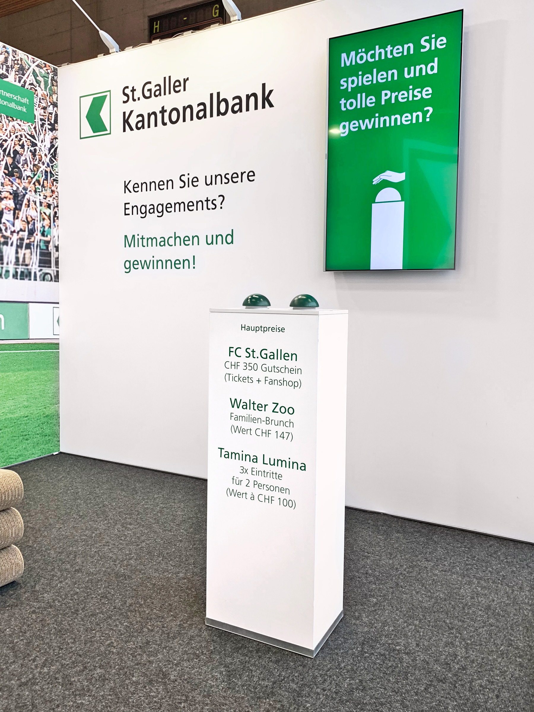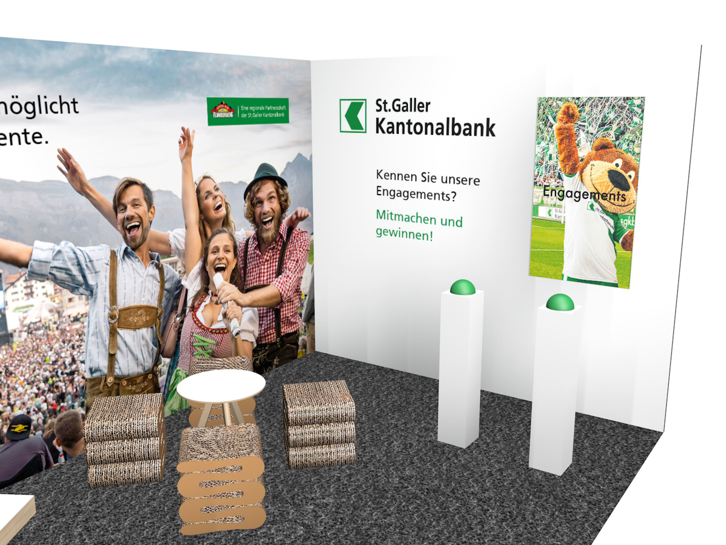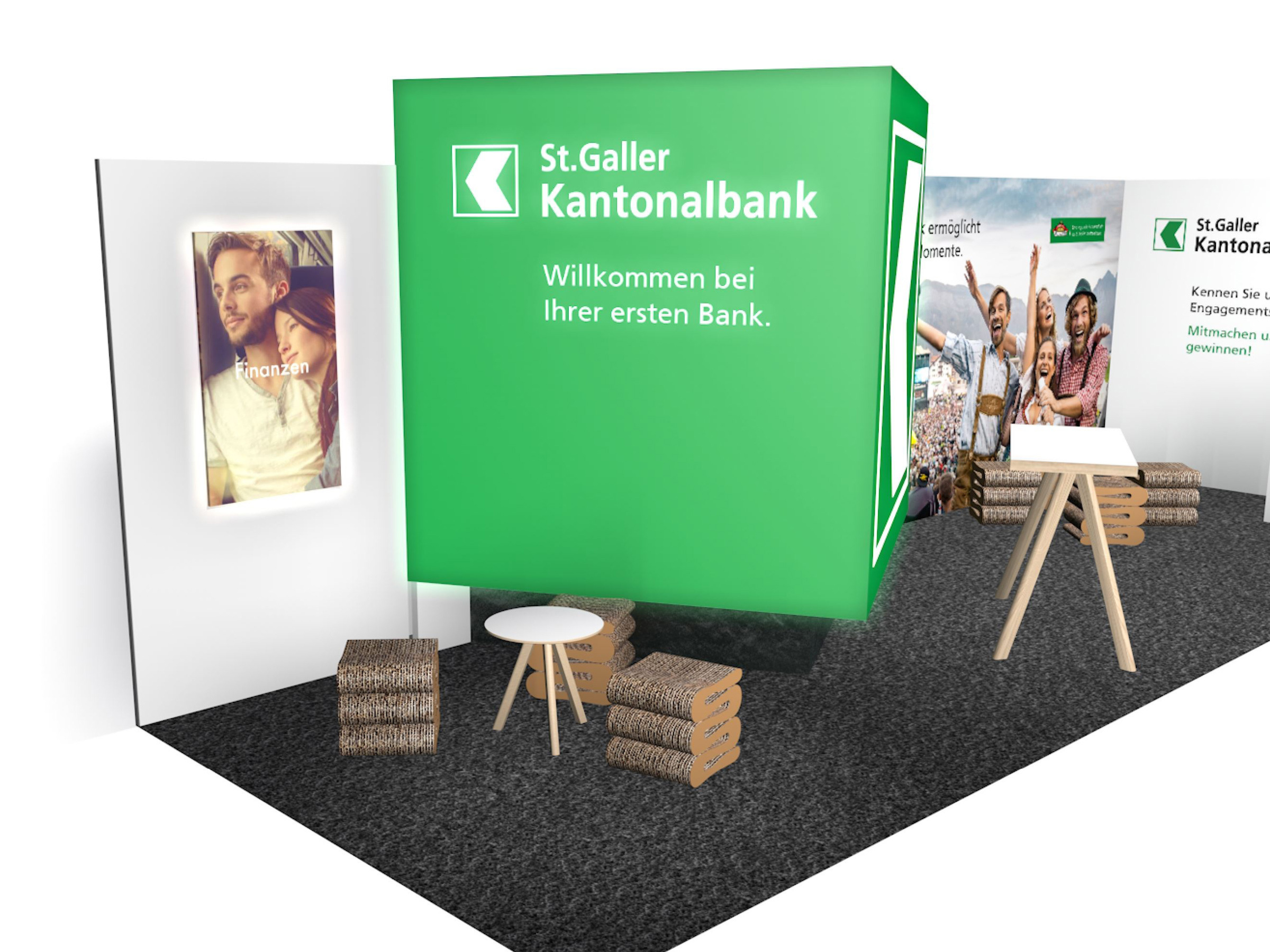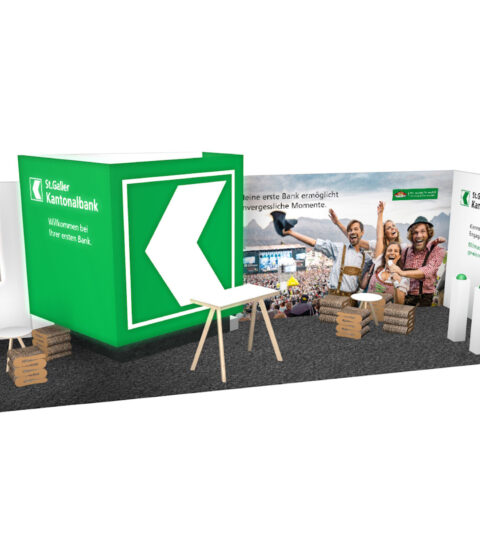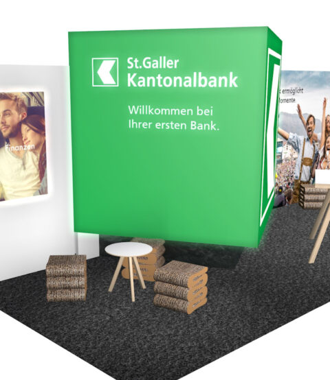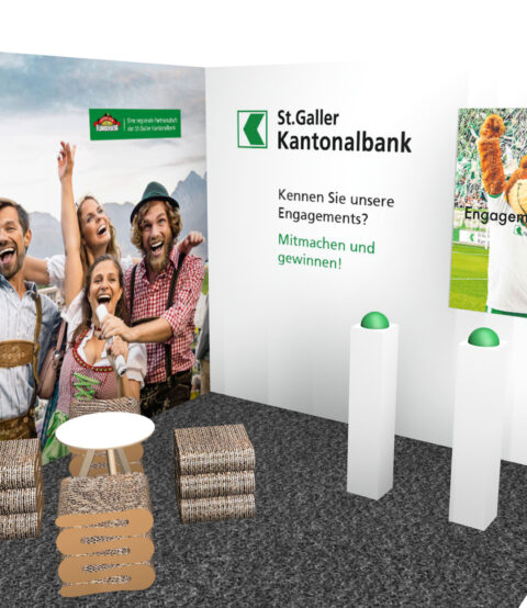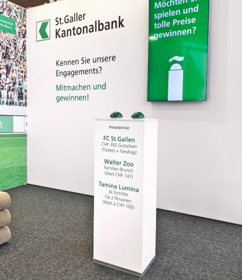 St. Galler Kantonalbank Messestände, Beschriftungen, Buzzerspiel und Sonder-Getränke. KundeSt. Galler KantonalbankJahr2019ArbeitenFoto, Video und 3D-Animation